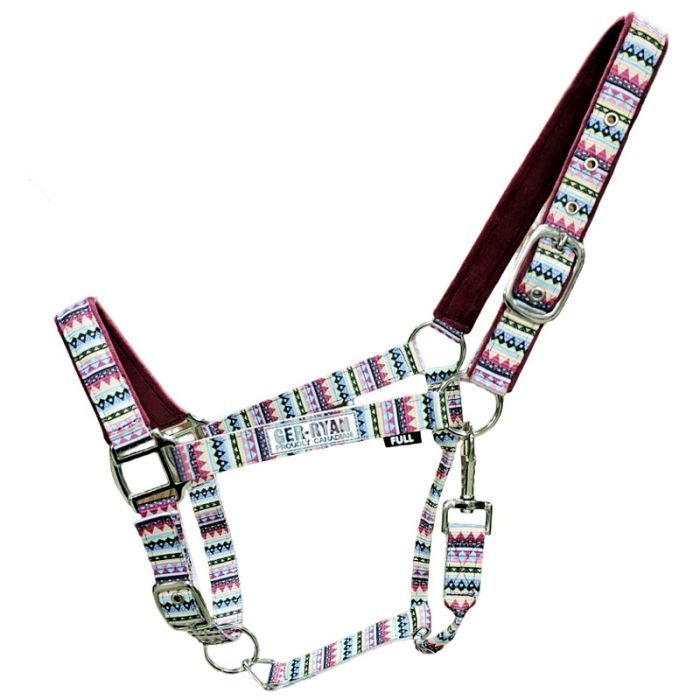 Nylon halter with Burgundy/Fuschia Southwest print design.